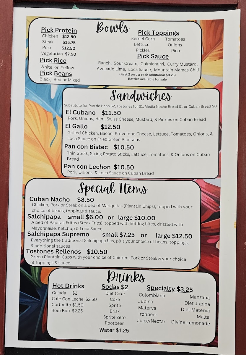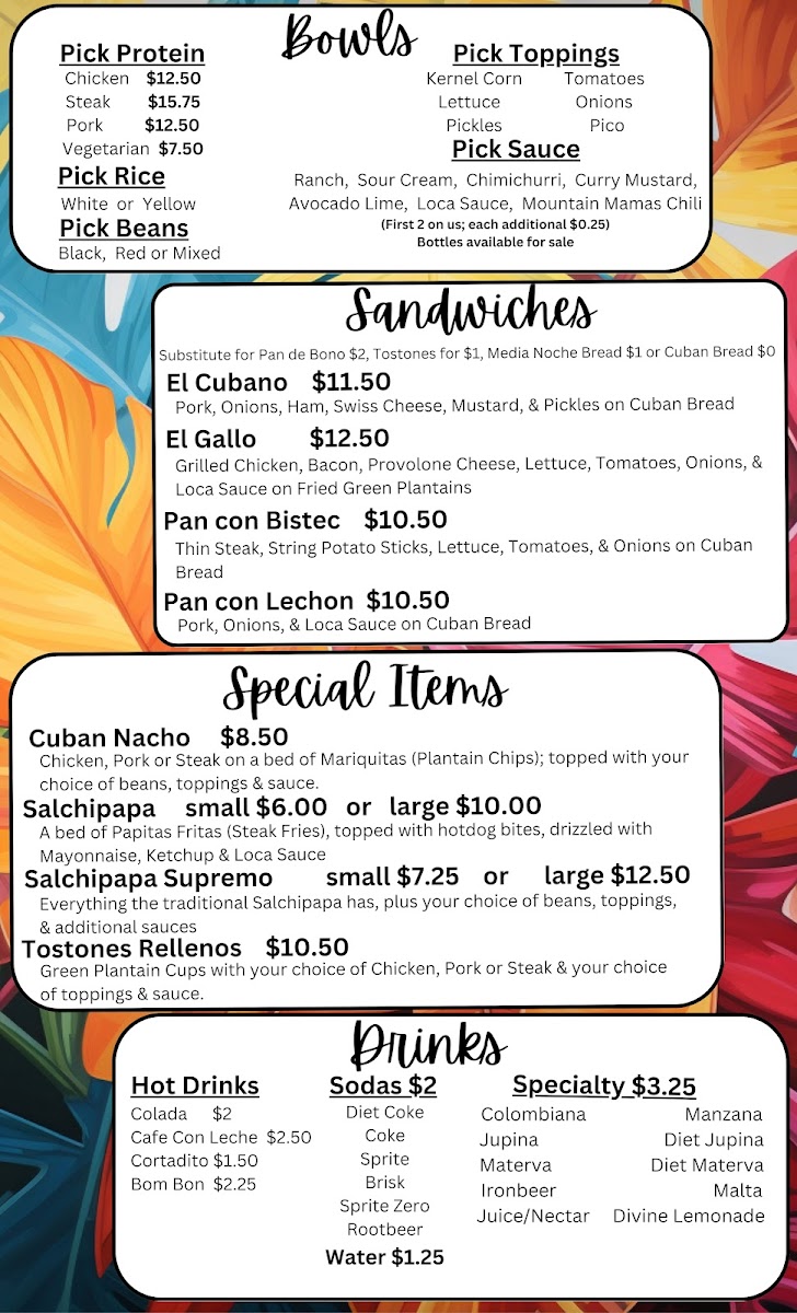 Chicken - Pick Rice: White or Yellow -Pick Beans: Black, Red or Mixed -Pick Toppings: Kernel Corn, Tomatoes, Lettuce, Onions, Pickles, Pico. -Pick Sauce: Ranch, Sour Cream, Chimichurri, Curry Mustard, Avocado Lime, Loca Sauce, Mountain Mamas Chili (First 2 sauces on us; each additional $0.25).