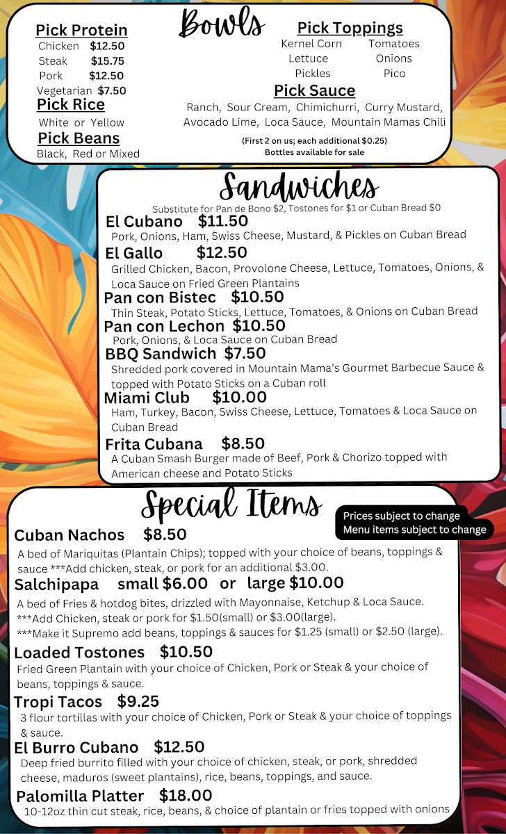 Pick Rice: White or Yellow -Pick Beans: Black, Red or Mixed -Pick Toppings: Kernel Corn, Tomatoes, Lettuce, Onions, Pickles, Pico. -Pick Sauce: Ranch, Sour Cream, Chimichurri, Curry Mustard, Avocado Lime, Loca Sauce, Mountain Mamas Chili (First 2 sauces on us; each additional $0.25).